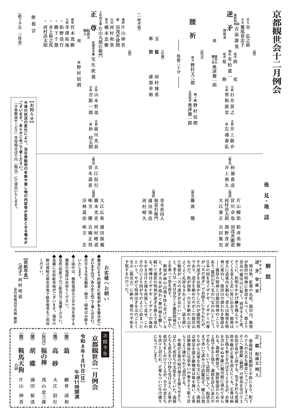 勅使が神の出現を待ち受けていると、まず天女が現れて舞の袖を翻し、続いて瀧祭の明神が逆矛を携えて現れる。明神はイザナギ・イザナミの海原をかき分けた様を再現して見せ、この矛の力により国が今のように治まったという。やがて明神は矛を元のごとく宝山(龍田山)に納め、御代の平和を予祝するのだった。
