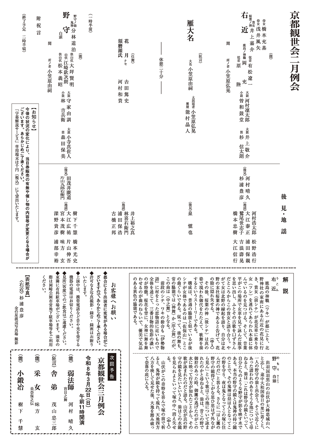 その後、桜葉の神(後シテ)は真の姿で現われ御代をたたえて、歌舞を奏するというストーリーである。